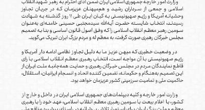 ما سفیران و روسای نمایندگی‌های دیپلماتیک و کنسولی جمهوری اسلامی ایران در سراسر جهان، به عنوان نمایندگان ملت بزرگ ایران و امینان منافع ملی، ضمن پاسداشت آرمان‌های والای انقلاب اسلامی و ادای احترام به شهدای والامقام، به ویژه فرمانده و مقتدای شهیدمان، حضرت آیت الله العظمی خامنه‌ای (قدس سره)، با رهبر شهیدمان و تک‌تک شهدای میهن از جمله ۱۷۵ فرشته کوچک مینابی که همزمان با شهادت رهبر عزیزمان در تهران، در جریان حمله موشکی اشرار آمریکایی-صهیونیستی به شهادت رسیدند، عهد می‌بندیم که با تمام وجود در میدان دیپلماسی از حاکمیت و عزت ملی و تمامیت سرزمینی ایران در برابر هجوم وحشیانه دشمن پاسداری کنیم.